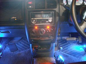 タイトル通り、ヘッドライトに連動する車内灯です。写真のオレンジのライトは、灰皿用。青色は、足元用だ。