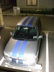 これが現在(2009/6現在)の我がキューブの姿です。外観で一番苦労したのは、やはりストライプです。っ実はあのストライプは二回目なのです。 バンパーのところが色が違うのに気付きますよね?あの濃い青・・・実は、地下塗装なのです。あれは、ボンネットまで続いております。 遠目ではきれいなのですが、良くみると、ムラが目立つのです。そんなことをある程度気にしながら、数か月乗っておりました。 そしてある日、店に出向くと、私のためにあるかのような、ストライプ用のカッティングシートが販売してあったのです。 その時は、金欠で買うべきか買わざるべきか悩みましたが、値下げされているということとダチの声が、勧しとなり、買ってしまいました。 といっても1000円もしなかったのですが。或或してきたので足早に帰宅し、張り始めました。それが、ナカナカ難しかったのです。 これからいかにして張ったか見ていくぞ。参考になれば参考にしてくれ。よし、やるが!